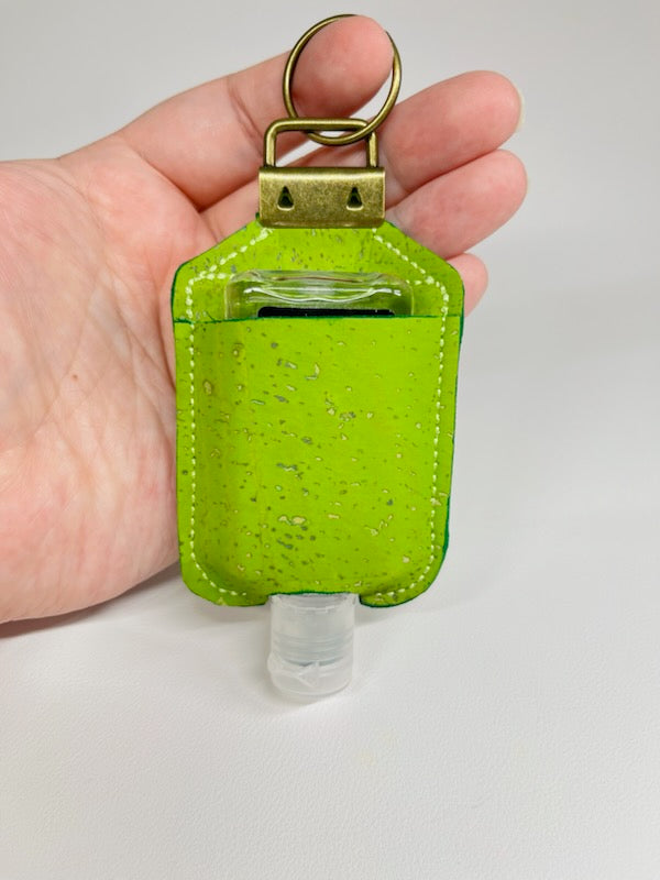 Dimensions and Material: 2.5 inches wide by 3.25 inches tall. This sanitizer holder is made out of cork and cotton woven. This sanitizer holder holds 1 fl oz sanitizer bottles.